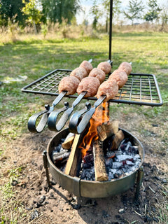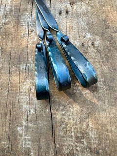 Set of 3, made from 3x14mm flat bar and are 45cm long in the traditional way from the forge to anvil. The handle is drawn down to a taper, scrolled, and twisted and seasoned with a baked-on oil finish that holds up well in the grill